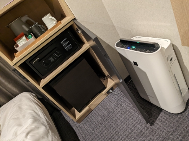 金庫、冷蔵庫、電気ケトル、そしてシャープのプラズマクラスターもあります!冬場は暖房必須となる寒い地域なので、これはありがたい。