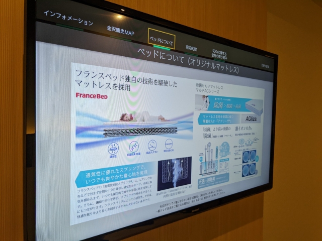 壁掛けテレビでは、ホテルの案内や寝具についてなどの情報が。チェックアウト時間、貸出備品、館内設備などの情報もこれで見ることができます。