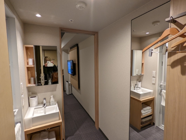 セパレートの影響か、洗面台はちょっと狭め。モノを置けるような工夫はあるので、身だしなみを整えるくらいなら特に問題なく利用できます。