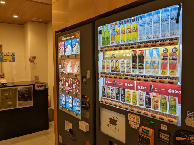 自動販売機は1階の受付横のみにあります。ラインナップはソフトドリンクとアイスでアルコールはありません。徒歩3分ほどのところにローソンがありますので、ご希望の方はそちらへ。