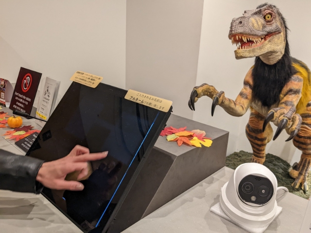 受付はタッチパネル。入力項目が多いので、意外と苦労します。そして、こちらを見てくる恐竜の強面フェイスもなかなかプレッシャー。お子様は大泣きするか、大喜びするかどっちかに分かれそうです。