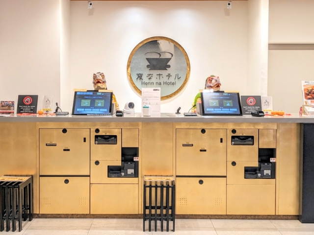 そんな変なホテル、宿泊者にとって最も「変」に映るのはなんといってもロボットによる受付。人形型、女性型など店舗によって様々なロボットが受付業務を行っています。世界初のロボットが働くホテルとしてギネス認定もされたそう。