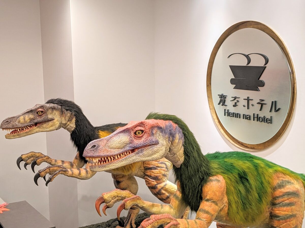 さてさて、そんなわけで前乗りした初日に利用した変なホテル。翌朝出発にあたりチェックアウトしようとすると、恐竜たちがおじぎしておりました!朝は活動停止してるみたいです。