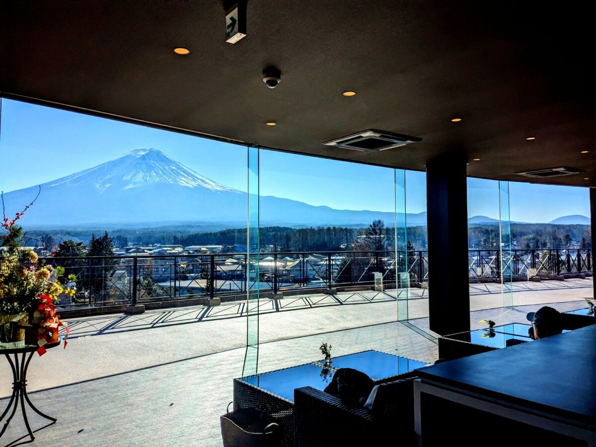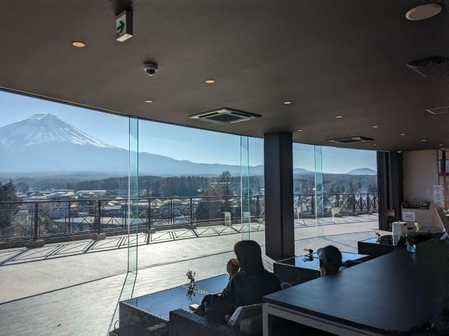 エスカレーターで上ると、そこは屋内の展望フロア。ゆったりしたソファが置かれており、暑い夏でも寒い冬でも快適に富士山を眺めることができます。