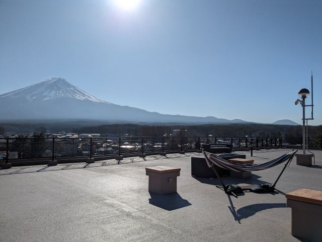 そこから階段を上ると屋上へ。広々としたデッキにはハンモックも置かれています。天気の良い日はのんびりと過ごせる場所です。