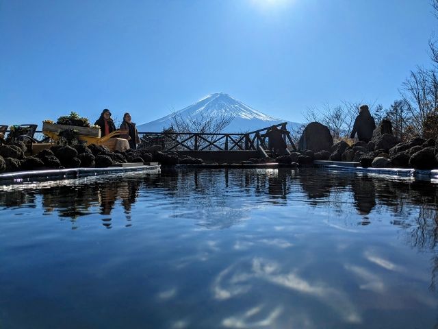 カメラを構えると、逆さ富士が撮影可能!水面ギリギリまでカメラを近づけるのが上手くとるコツです。ただし、少しでも風が吹くと水面が乱れてしまうためタイミングはシビア。こればっかりは運が必要ですね。