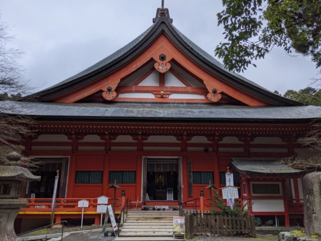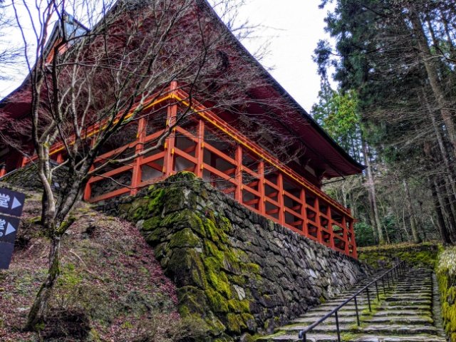 横川エリアに立ち、最初に目に入るのが横川中堂。横川エリアの中心で、石垣の上に建つ朱色の立派なお堂です。