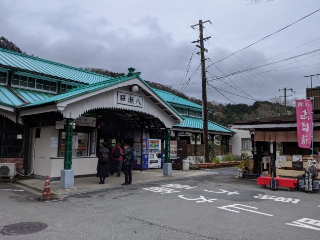 ケーブル八瀬駅から叡山電鉄の八瀬比叡山口駅までは徒歩移動。約3分ほど歩きます。かつては遊園地が建設されてにぎわっていたそうですが、今ではお漬物屋さんが営業するのみの静かな雰囲気の駅。緑色の屋根と、掲げられた右書き「驛瀬八」の扁額がレトロ。
