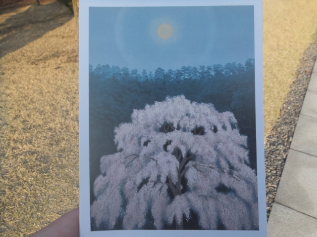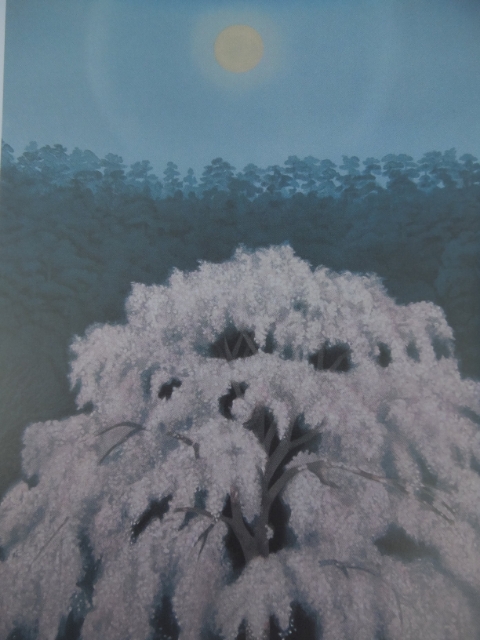 しだれ桜と満月を描いた作品。深い森を背景に、光る桜とぼんやりとした満月に目が奪われます。