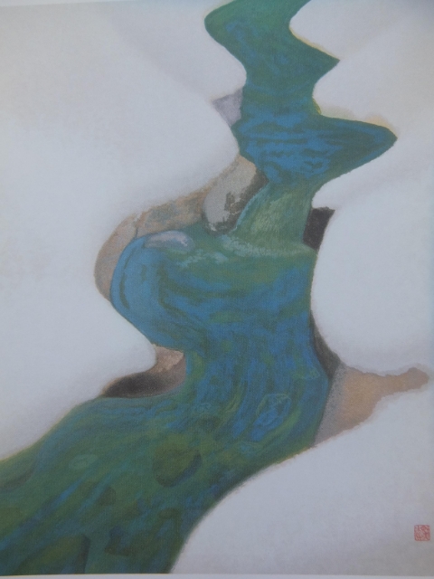 キャンバスの中心を流れる雪解け水は、冬の終わりの寂しさと春の訪れの喜びを表しているかのようです。