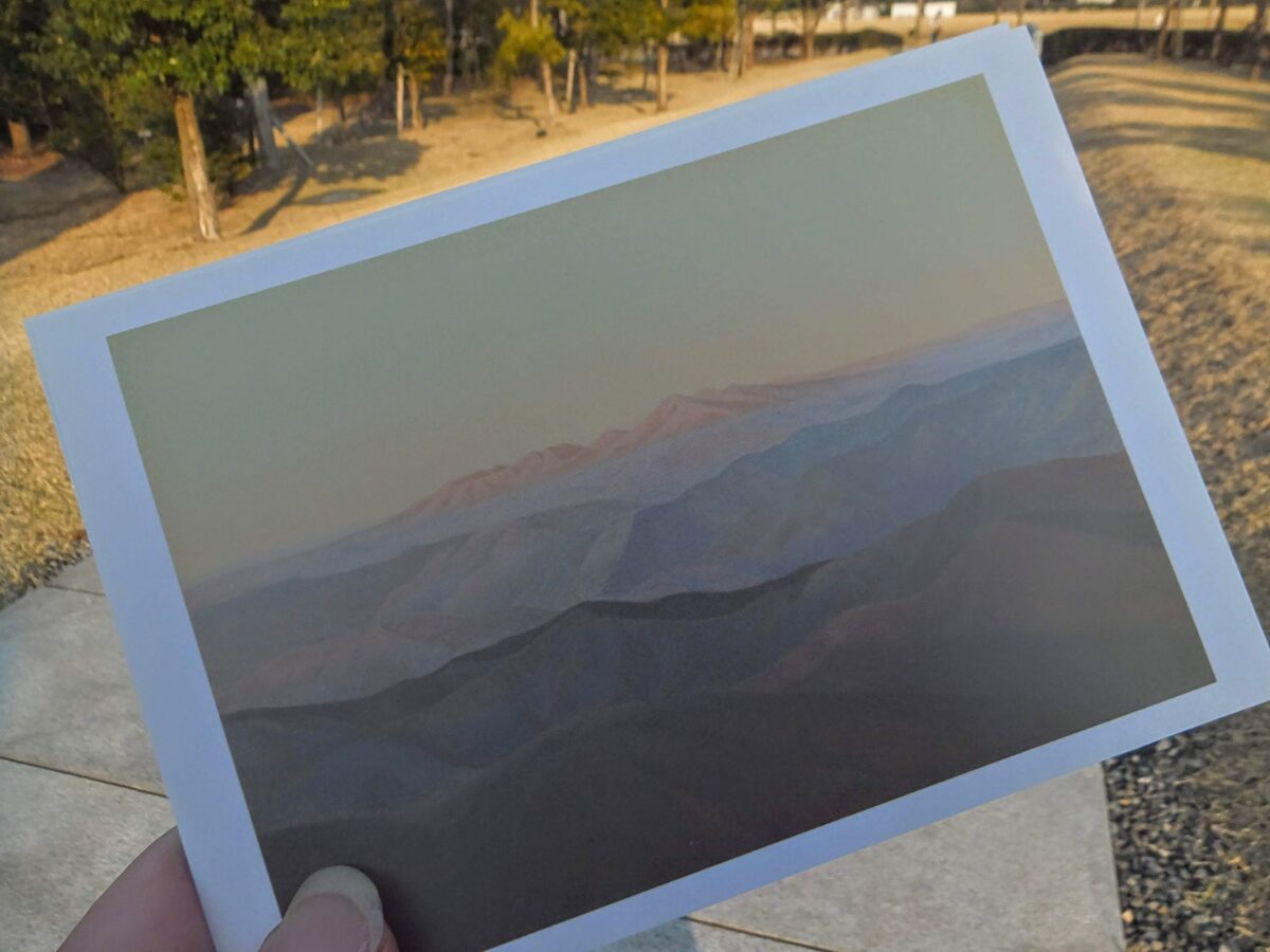 『残照』に描かれた壮大な景色は、千葉県君津市の鹿野山(かのうさん)。高い山の少ない千葉県にもこんなにも深い山々があるのですね。アクセスも悪くないので、そのうち行ってみようかな。