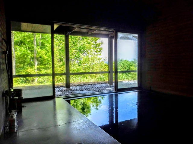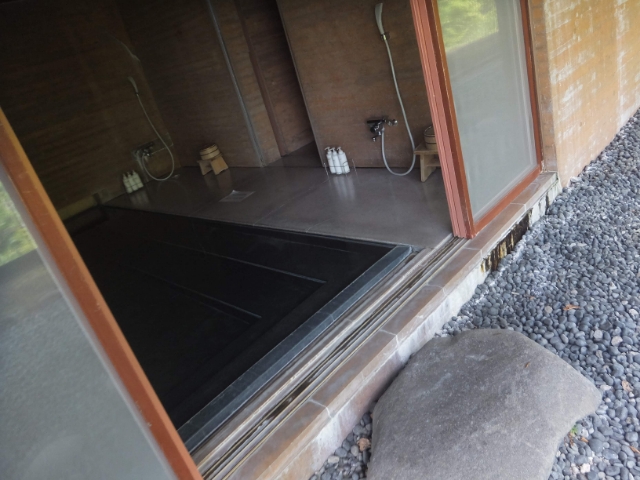 お風呂も見学可能です。居室の下、1階部分にあるのですが、引き戸を開けば半露天のような気分で入浴可能。里山の自然を眺めながらの貸し切り風呂なんて最高すぎます。