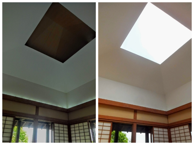 左がビフォー、右がアフター。ウィーンと和室に不釣り合いな機械音が響き、天井が開きました。