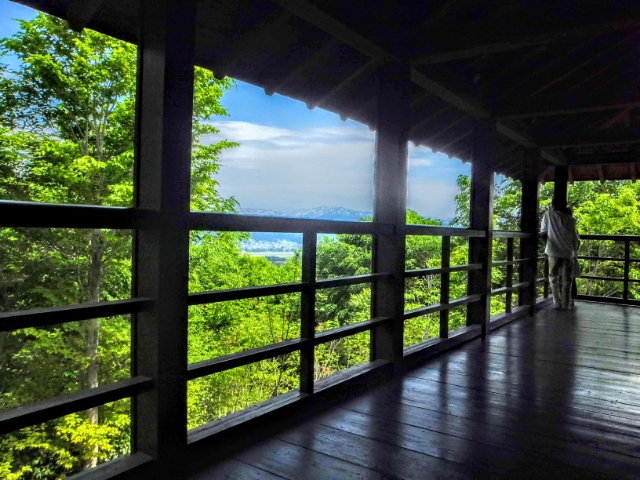 館のまわりを一周するように縁側があります。このスペースは幅が広く、ごろんと横になることも可能。5月に訪れたところ、新緑が床に反射した「床みどり」がとってもキレイ。