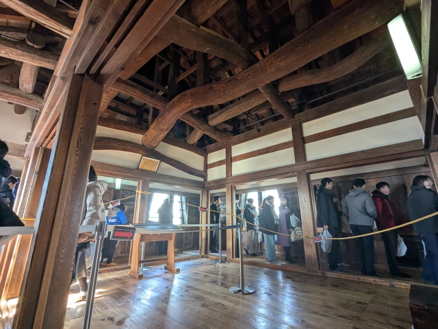 お城の天守閣といえば資料館のようになっているケースが多いですが、彦根城の内部は展示物はほとんどありません。その代わり「鉄砲狭間」や「矢狭間」、破風の中に造られた「破風の間」など、様々な機能を見学することができます。