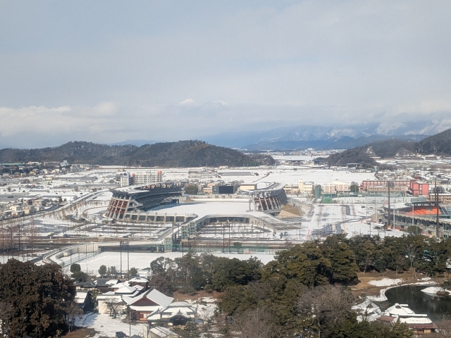 北東方面を望むと、平和堂HATOスタジアム。2023年に開業した陸上競技場です。雪に包まれた姿がなんとも絵になります。