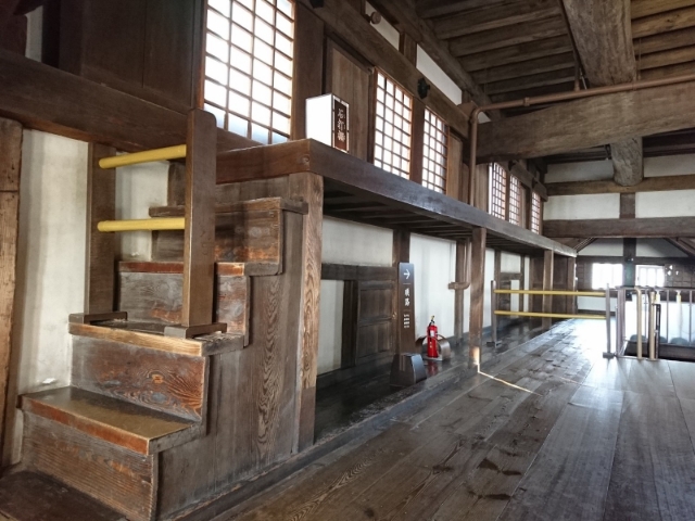 城外の敵を監視したり射撃するための足場として設置された「石打棚」。武具掛けとともに、あくまで戦うことを念頭において造られた城ということがひしひしと伝わってきますね。
