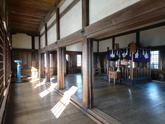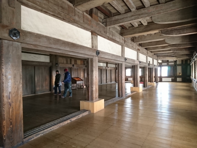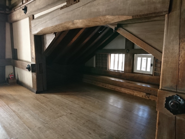 このような歴史的な建築物に入ると、現代人がここで暮らしたらどんな生活になるのか考えてしまいます。「破風の間」は仕切りで区切って秘密の部屋を作りたくなります。「武具掛け」には木の板を乗せておしゃれな棚にアレンジできそう。ロフト風な「石打棚」はどうしよう・・・。寝るには少し幅が狭いし、物置にするのにも適さなそう。とりあえず下段を収納にして、日当たり良好な上段には観葉植物を並べてみたいところです。