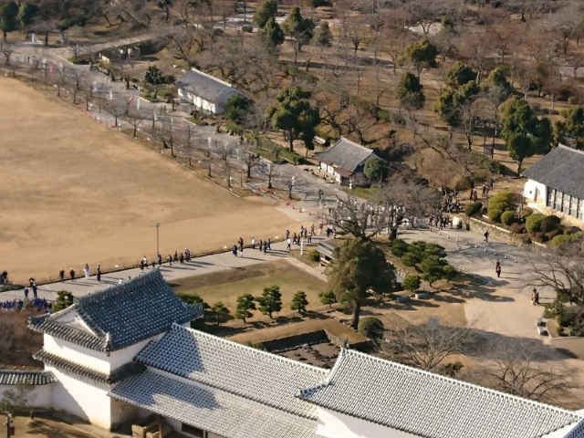 足元に広がる姫路城公園を見ていると天守閣に迫るたくさんの人々。まるで敵軍が攻めてきたかのような気持ちになってきました。