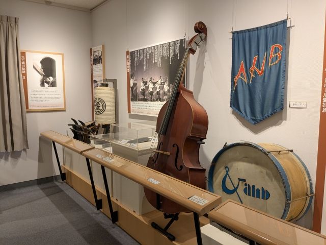 ずらりと並んだ楽器は「青い鳥楽団」のもの。目の不自由な入所者を中心に作られた楽団で、入所者に生きる希望をあたえていました。