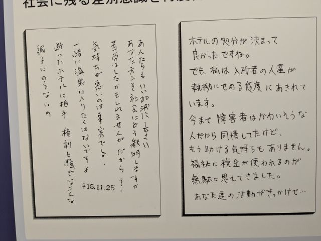展示されている入所者を批判したハガキは、ヤフコメやXにあふれる批判文とほぼ同じトーンの言葉。20年も前の話ですが、人々の考えはあまり変わっていないかもしれません。