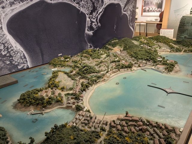 こちらは、当時の長島のジオラマ。様々な施設や、強制隔離政策下で暮らしていた狭小住宅「十坪住宅」がずらりと並んでいます。
