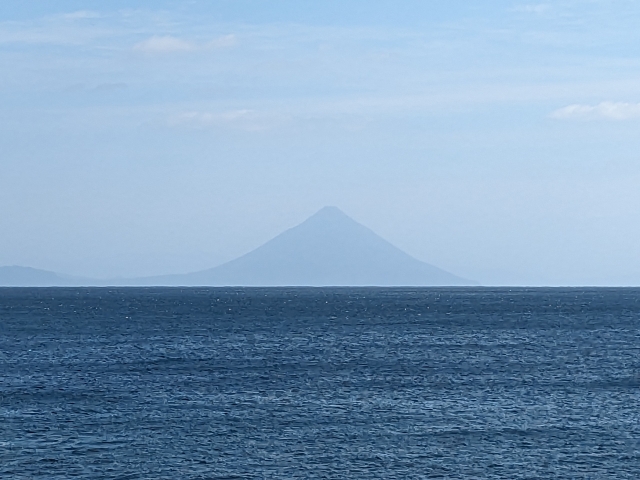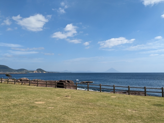 天気が良いと、海の向こうに開聞岳(かいもんだけ)の姿も。薩摩富士とも呼ばれる美しい山で、海に向かって裾野が広がる姿が優美です。