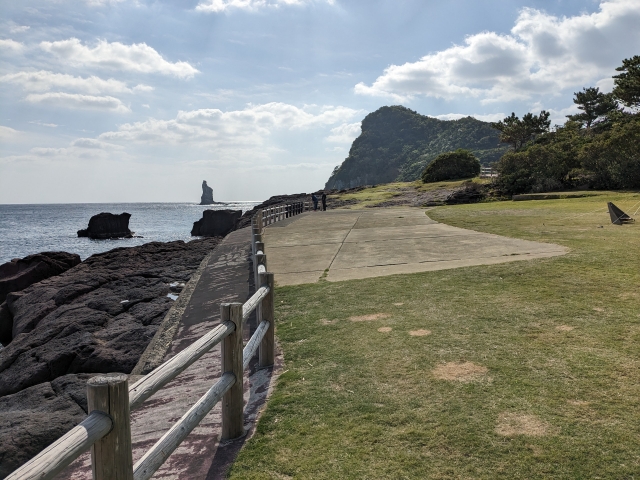 海辺に広がる開放的な公園は、海にそびえたつ巨岩「立神岩」のビュースポット。「海幸山幸」のストーリーで知られる山幸彦にも縁のある場所です。