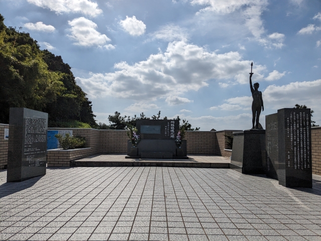 さらに、少し奥へと進むと平和祈念展望台があります。戦艦大和の沈没50周年に建立された展望台。殉難鎮魂之碑や女神像が建立されており、厳かな雰囲気があります。