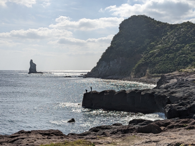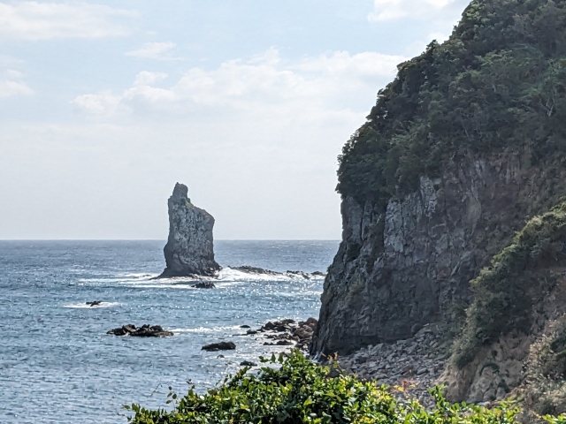 海を臨むと、海中から岩がそびえ立っているのが見えます。こちらは標高42mの「立神岩」。独特なカタチの巨岩は存在感抜群です。