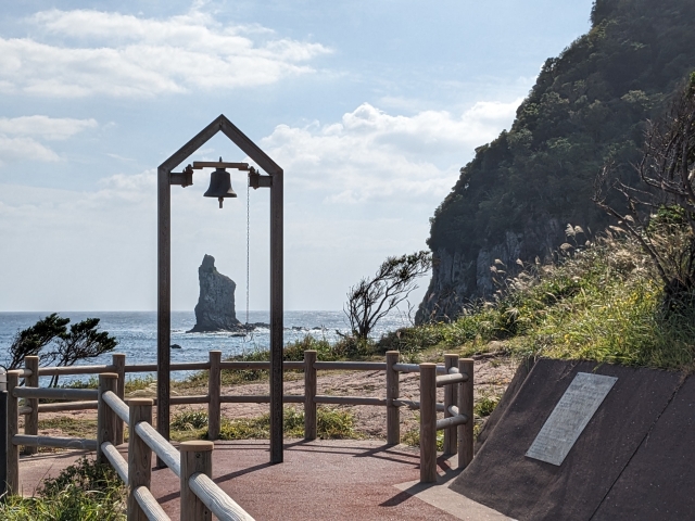 そんな立神岩のビュースポットには、未来をつむぐ幸せの鐘が設置されています。枕崎市民の有志により結成された「未来をつむぐ幸せの鐘プロジェクト」が寄付を募り、2019年に完成。将来の夢や二人の愛を願い鳴らすそうです。