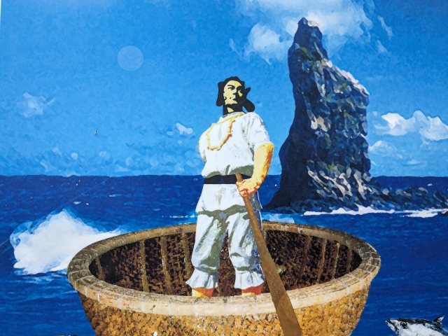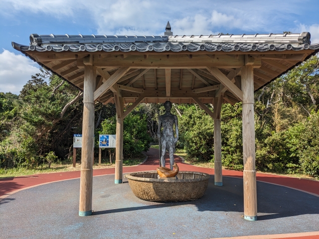 山幸彦が海を渡る際に乗ったのが継ぎ目が無いくらいに細かいカゴの船、「無目籠(めなしかご)」※別名:无間勝間(まなしかつま)。実はこの山幸彦の像は、この籠に乗るように設置されています。