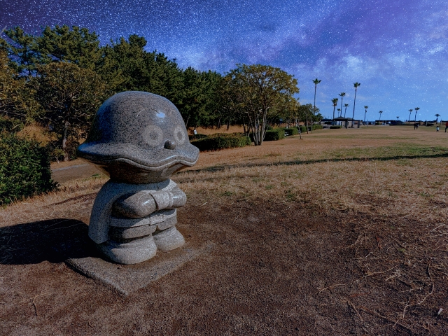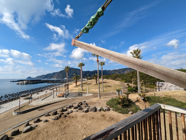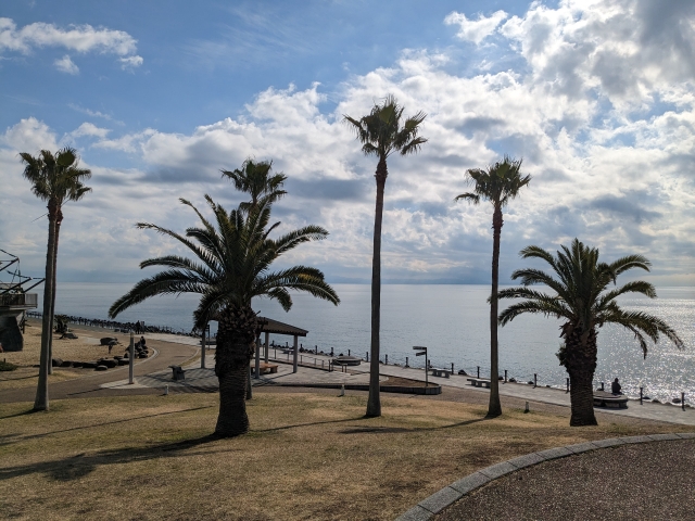 そんな用宗港からほど近くにある広野海岸公園(ひろのかいがんこうえん)は、海辺に広がる開放的な公園。目の前には雄大な太平洋が広がり、植えられたワシントンヤシやソテツの木が南国の雰囲気もプラス。歩いているだけで前向きな気持ちになってきます。
