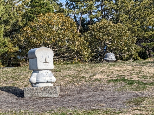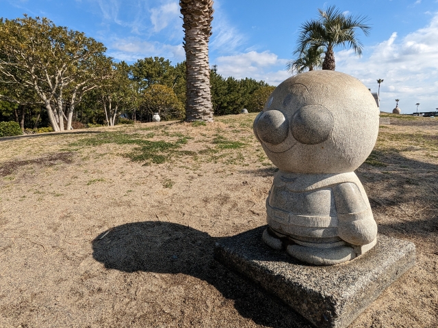 難破船のそばにはアンパンマンの石像が!直立不動の姿がとってもかわいらしい。