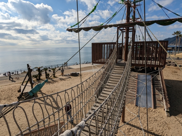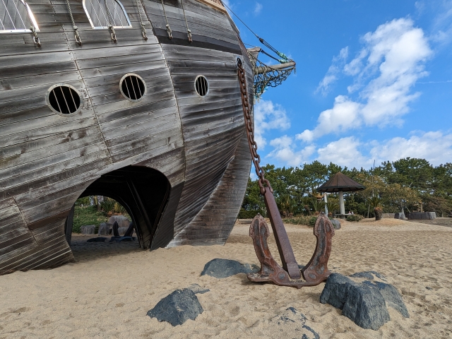 お気づきの方も多いとは思いますが、この難破船は実は公園遊具であり、自由に登って遊ぶことができます。大人が見てもワクワクしてしまう難破船、子どもたちは目を輝かせて走り回っています!