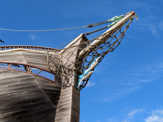 全長33m、高さ18mにも及ぶ巨大な船は迫力満点。ちゃんと錨も備えられており、細部までリアルに仕上げられています。