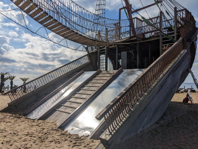 割れた船体の斜めの部分は、傾斜を利用した滑り台。船のまわりは砂浜なので、思いっきり滑ってもケガの心配は少なそうです。