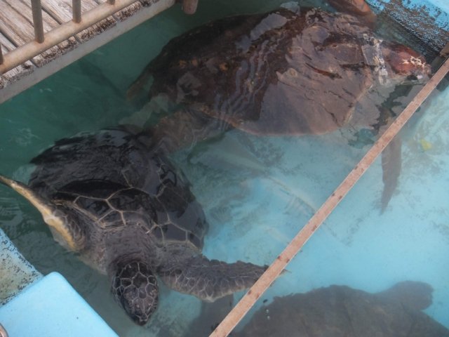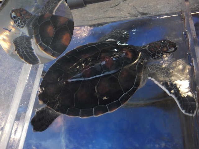 並べてみると、その違いは一目瞭然。写真手前のスマートで白っぽいのがアオウミガメ、写真奥のずんぐりしていて強そうな赤茶色のがアカウミガメです。