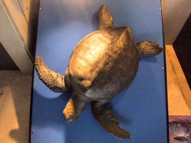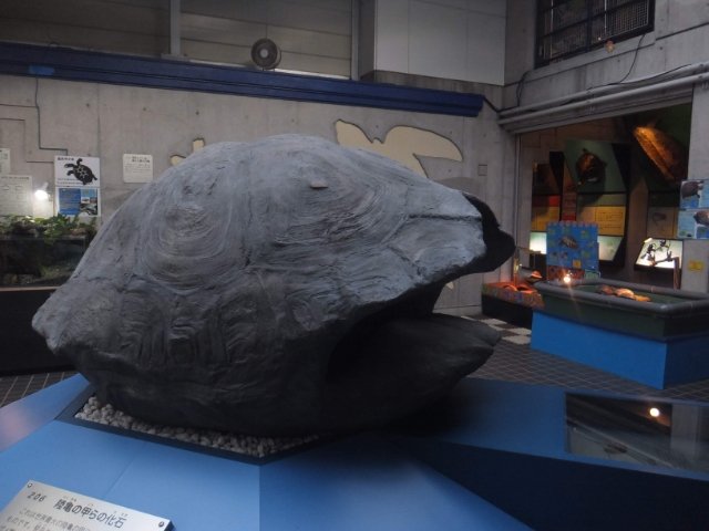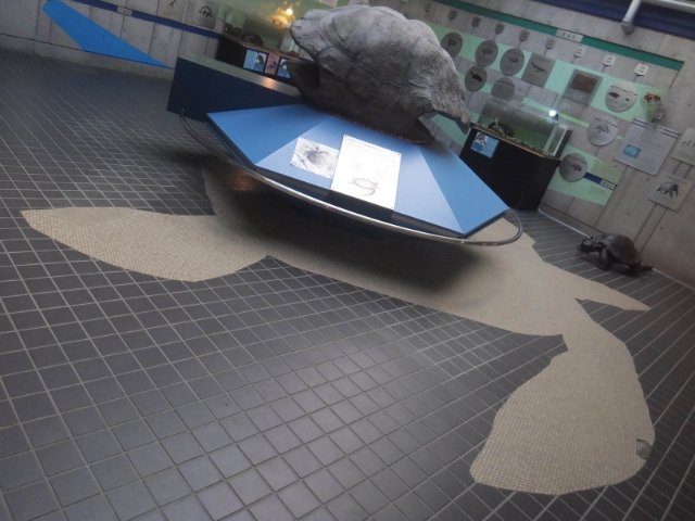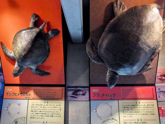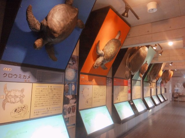 館内はカメに関する様々な展示が並ぶ、まさにカメミュージアム。アカウミガメ、アオウミガメ、ヒメウミガメ、タイマイ、そして現代で最も大きい亀であるオサガメと有名なウミガメたちが勢ぞろい!