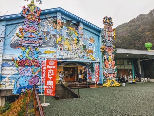 市街地から遠く離れた山の中にある水色の大きな倉庫。こちらが海洋堂ホビー館。一見すると、木材加工の作業場のような山間部では珍しくない建物。