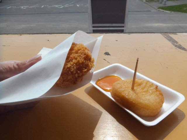 ほくほくのコロッケは、じゃがいも本来の甘味がたっぷり!優しい甘さなので、全然くどくありません。いももちはみたらし味でこちらも甘口でした。