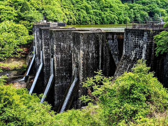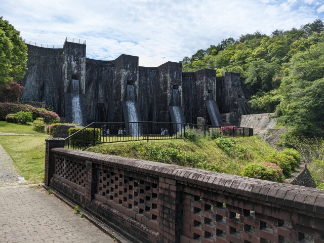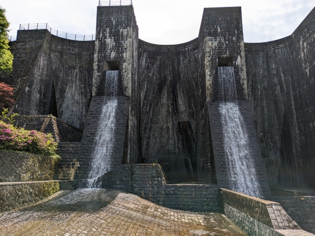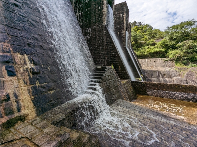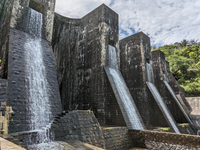 香川県観音寺市にある豊稔池ダムは、石造りのお城のような風格をまとった姿が印象的なダム。地元の人々が力を合わせて造り上げたこの建造物は、国の重要文化財として今も大切に保存されています。