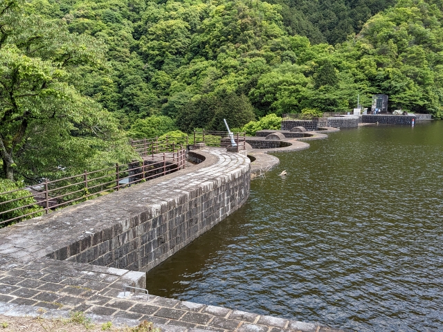 ダムの規模は堤高30.4m、堤頂長は128m。昭和以降に造られたコンクリートの巨大ダムに比べると少し小さく感じますが、間近でみるとなかなかの迫力。