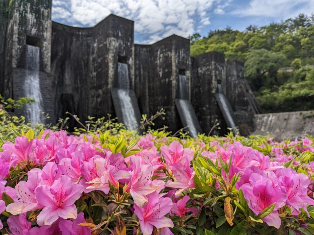 ダムの周辺は豊稔池湧水公園として整備されています。屋根付きの休憩所や洋式トイレもあり、お弁当を食べている人の姿も。5月に訪問したところ、ツツジがあざやかなピンクの花を広げていました。ダムとのコラボレーションも素敵です。