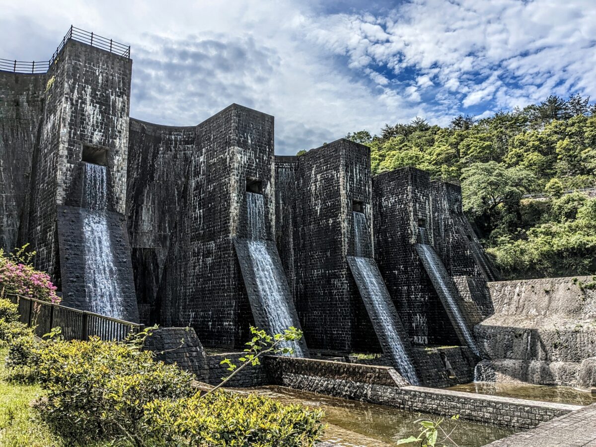 香川県観音寺市にある豊稔池ダムは、石造りのお城のような風格をまとった姿が印象的なダム。地元の人々が力を合わせて造り上げたこの建造物は、国の重要文化財として今も大切に保存されています。