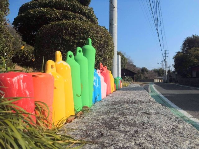 たまたま通りかかった近くの本島中学校の前には色とりどりのブイが飾られています。使わなくなった漁具をペイントしたかわいらしい作品たち。