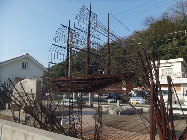 かつて塩飽水軍の根拠地だった本島は、優れた造船技術を持つ船のスペシャリストが暮らしていました。日本で初めて太平洋を往復した「咸臨丸」にも塩飽の人々が多く乗っていたといいます。この作品はそんな塩飽の人々の技術を広く伝えるために作られた作品であるそう。