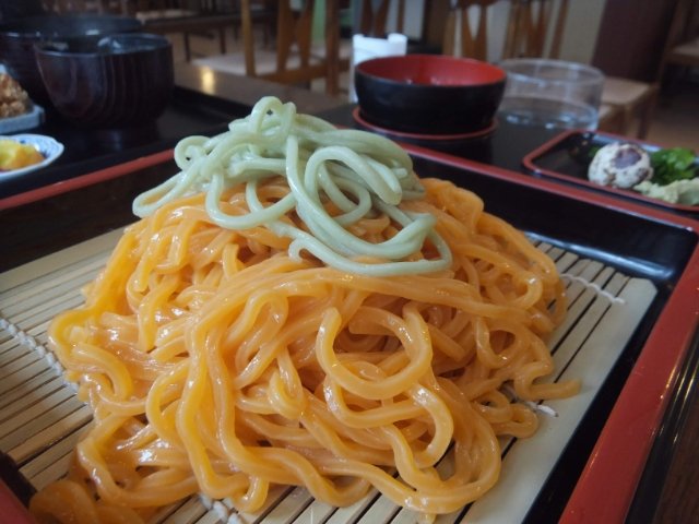 名物の柿ざるうどん。柿が練り込んであるオレンジのうどんに緑色の麺が乗っており、柿らしいカラーリングのメニューです。気になるお味ですが、コシがあってとっても美味しいうどん。かすかにフルーティーさも感じることができます。