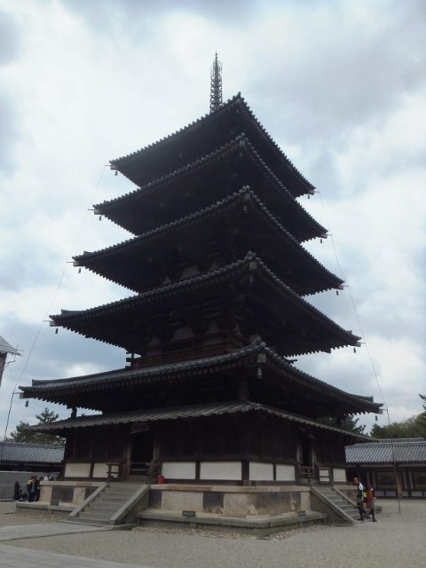 中門をくぐり西院伽藍へと進むと、まず目に入るのは五重塔。高さ32.5m、最古の五重塔です。写真ではわかりにくいのですが、最下層である初層の軸部分は、最上層の倍に造られているため、どっしりとした安定感を生んでいます。