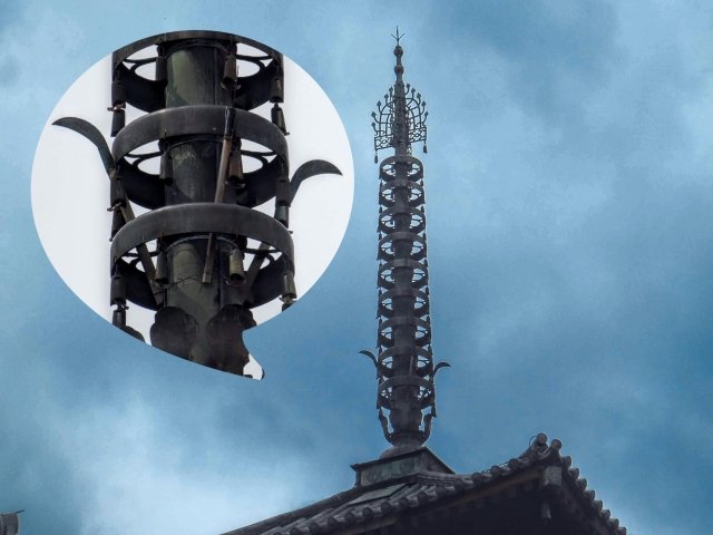 五重塔の最上部にそびえる相輪をよく見ると、カマがかかっています。
